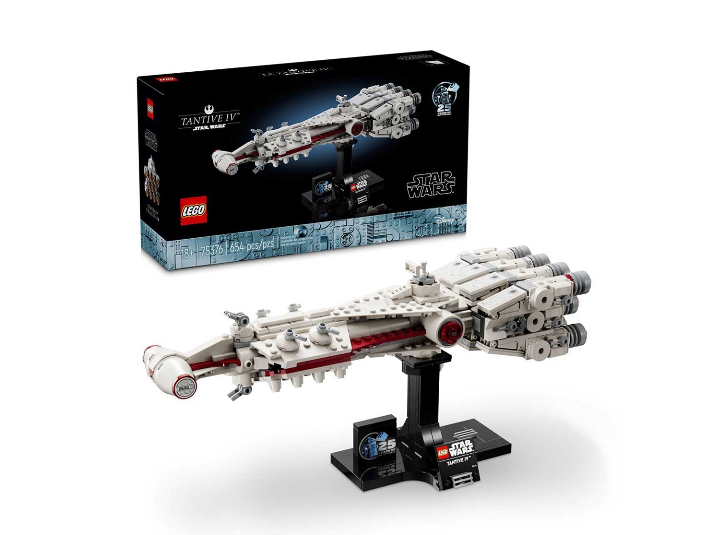 Соберите детализированную модель «Тантива IV» с 11 двигателями и турболазерами, используя кубики LEGO. Разместите звездолет на подставке с именной табличкой и кубиком LEGO Star Wars, посвященным 25-летию серии, чтобы создать впечатляющий экспонат.